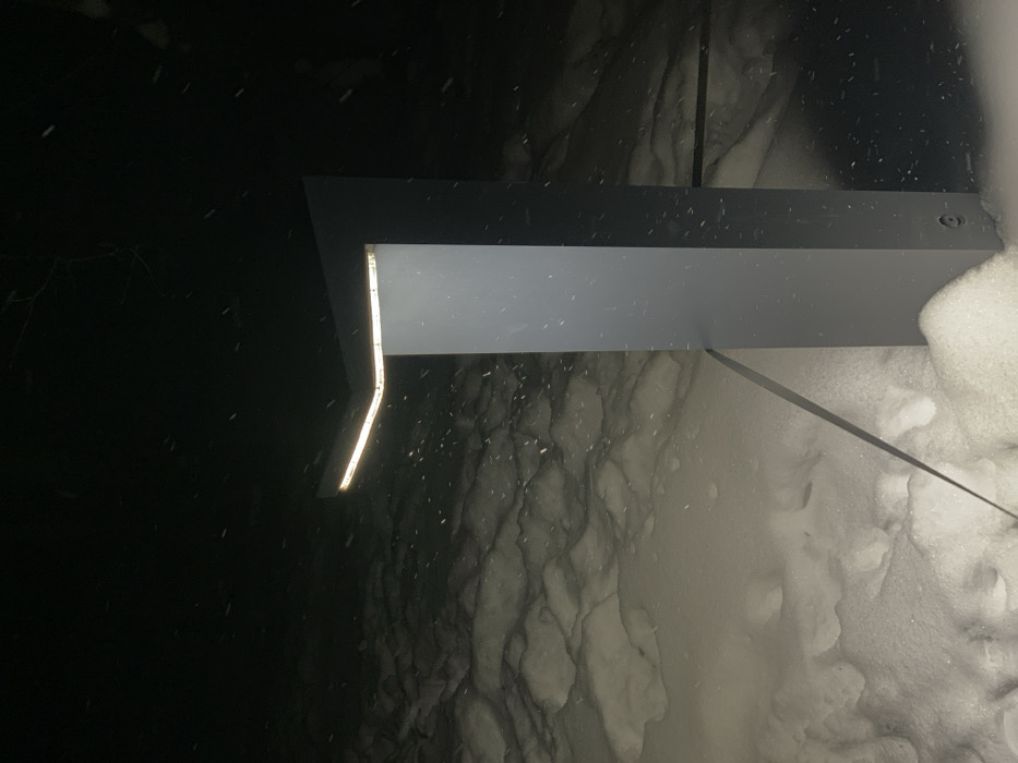 A dark, low-angle shot depicts a modern, gray exterior light fixture. Its rectangular form extends horizontally, emitting a warm light strip along its left edge. Snowfall is visible, creating a textured backdrop of gray and white. A wall, likely concrete or a similar material, runs vertically behind the light, also obscured by falling snow. Part of the fixture is covered in fresh snow.