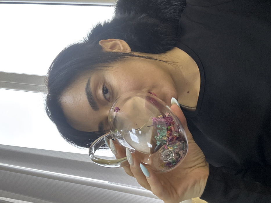 A woman with dark hair and manicured nails holds a clear glass mug filled with colorful flowers and liquid. She's positioned near a window with blinds. She wears a black top, and a necklace is visible. The focus is on her face and the cup she's holding.