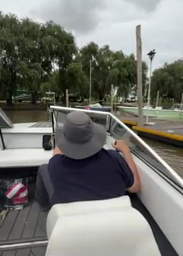 From a camera inside a boat, a man wearing a hat and dark shirt sits in the driver's seat and steers the boat away from a dock on an overcast day. The boat is white with grey flooring. In the foreground, a white seat faces forward. Through the windshield, a view of the dock and surrounding green trees is visible. There's a bag with a red and white cloth in the background.