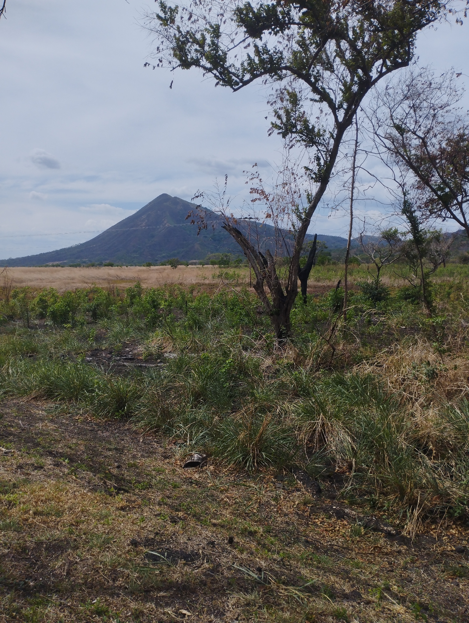 landscape with a mountain in the background. In the foreground, there's grassy terrain with some bare patches of earth and vegetation. A tree with sparse leaves is positioned to the right, partially obscuring the view. The sky is partly cloudy. There is no indication of the location being the city of Gamelotal, Venezuela. The scene depicts a natural environment with no people or apparent actions taking place.