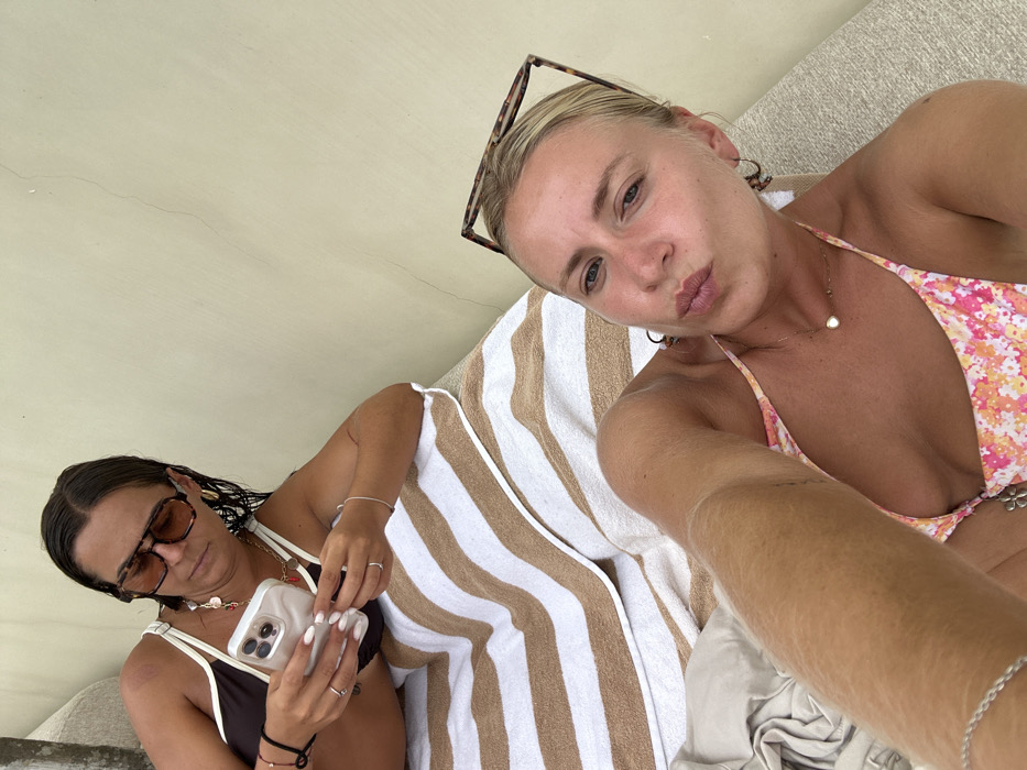 Two females are depicted relaxing outdoors in Kathaluwa, Sri Lanka. In the foreground, a blonde-haired individual with tortoise-shell sunglasses resting on her head poses for a selfie, facing the camera with slightly pursed lips. She wears a multi-colored floral bikini top, a delicate necklace with a small pendant, and earrings. Her left arm is extended towards the camera. Behind her, to the left, a dark-haired individual reclines on a tan and white striped towel, engaged with a light-colored smartphone held in both hands. She wears a dark brown bikini top with white straps, dark aviator-style sunglasses, a layered necklace with coin-like charms and red beads, and multiple rings. Her hair appears wet. The background consists of a plain, light beige wall, exhibiting minor vertical cracks. Both individuals are situated on lounge furniture under bright, natural light.