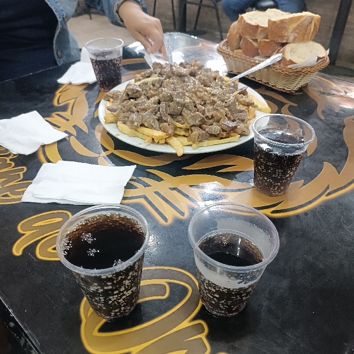 An indoor dining scene is depicted at a location in Los Teques, Venezuela. The central focus is a dark table with golden/yellow stylized patterns. A large white oval plate contains a substantial serving of french fries topped with numerous pieces of stewed meat covered in a light-colored sauce. To the upper right, a woven basket holds several slices of white bread. Four clear plastic cups, each containing a dark, carbonated beverage with visible bubbles, are arranged on the table; three are in the foreground, and one is further back. Several white paper napkins are stacked on the table. A person's hand, wearing a denim sleeve, is visible in the upper left, holding a utensil over the main food plate, indicating active consumption. The background is dimly lit and out of focus, suggesting an indoor restaurant or eatery environment.