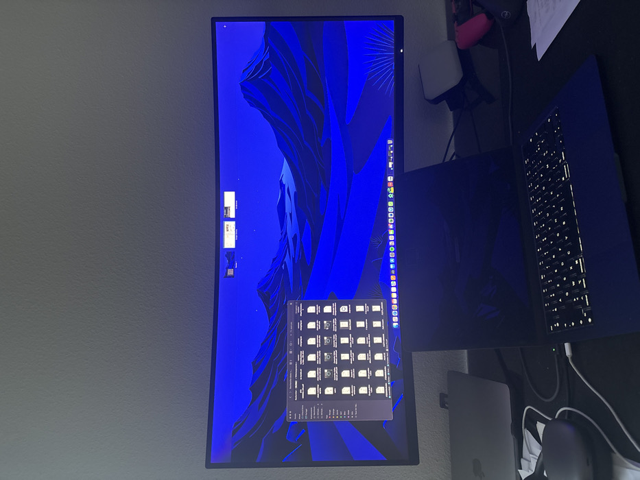 The image displays an indoor computer workstation set in a dimly lit room with light gray walls and a dark, reflective desk surface. No individuals are present. A large, curved ultrawide monitor is positioned centrally, exhibiting a vibrant blue digital wallpaper depicting stylized mountains and valleys. A macOS dock with various application icons is visible at the bottom of the screen. A Finder window, titled "Recherche dans..." (Search in...), is open on the left side of the monitor, displaying multiple generic document and image file icons. Two small, active application windows are also visible at the top-center of the ultrawide display. In the foreground, a dark-colored Apple MacBook laptop is open on the desk; its screen is off, reflecting ambient light, but its keyboard is illuminated with white backlighting. To the left, a silver-colored Apple MacBook laptop is closed and positioned further back. On the desk, to the left of the foreground laptop, are a gray, oval-shaped electronic device, possibly a wireless charger or speaker, and white cables. A crumpled piece of white fabric is also visible. To the right of the foreground laptop, a white rectangular external drive or hub, a red gaming controller (resembling a Nintendo Switch Joy-Con), a black computer mouse, and a piece of white paper are present, along with additional cables. The specific location in Sélestat, France, cannot be determined from the visual information provided in the image.