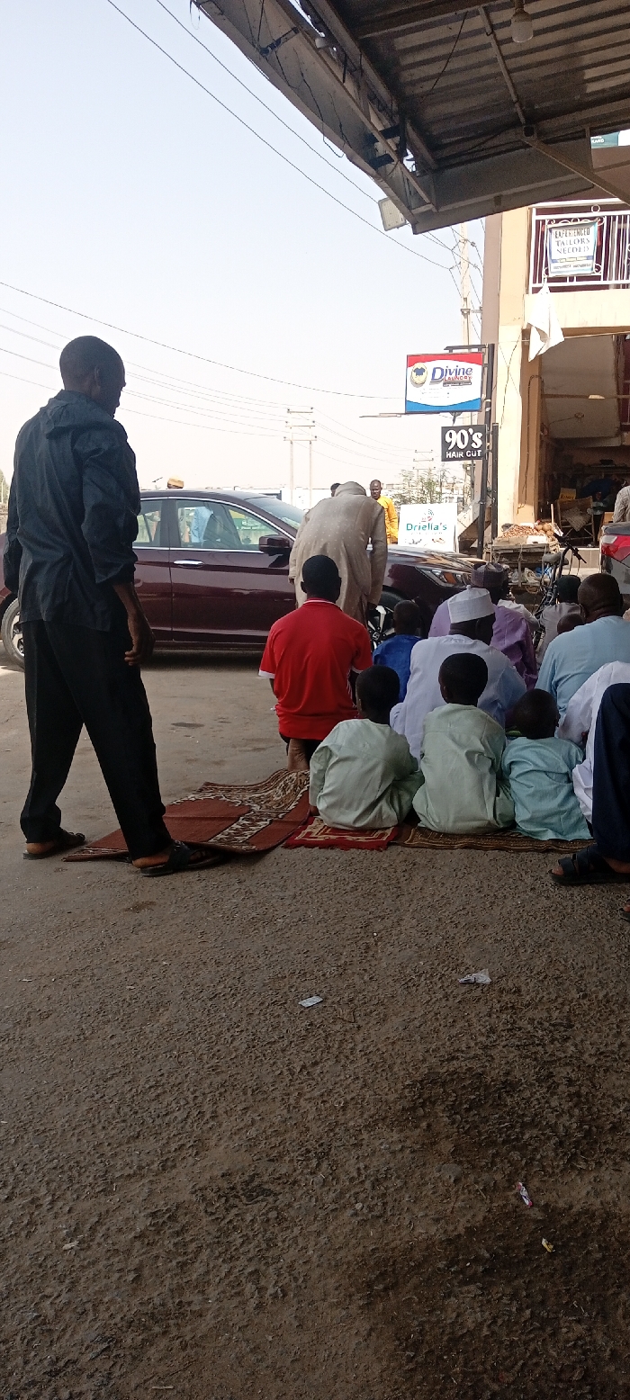- "The scene depicts an outdoor gathering for prayer on a paved surface in Aviation Quarters, Nigeria, under a bright, clear sky" by FM-oATT32, licensed under CC BY 4.0