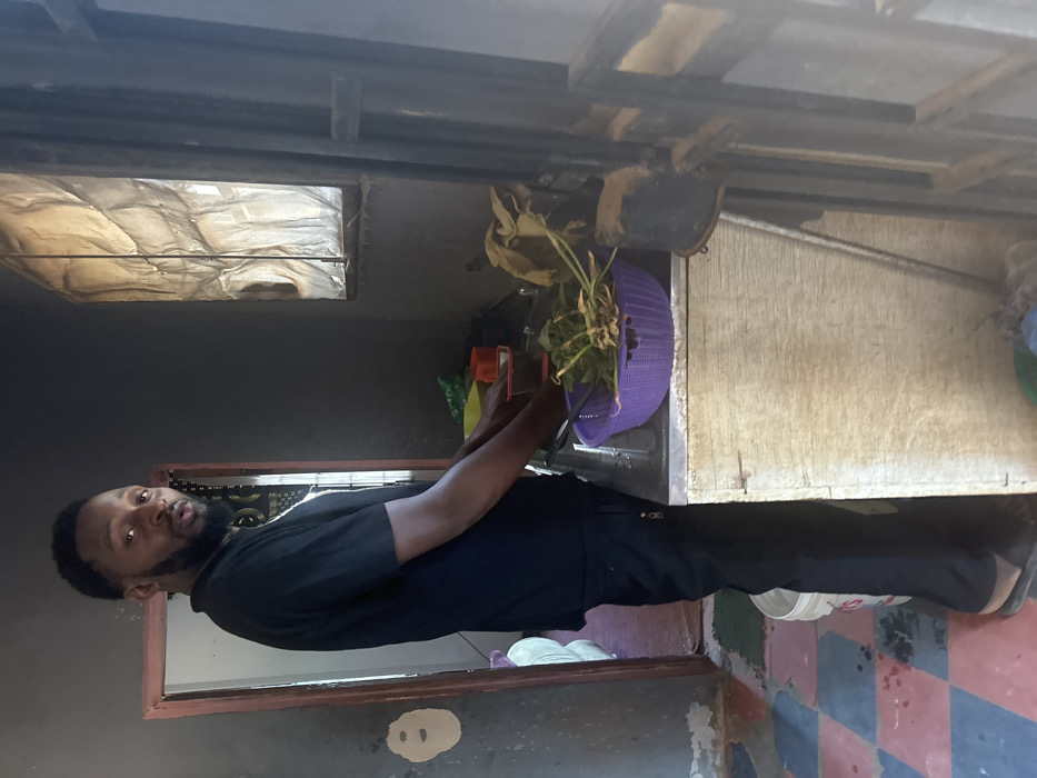 A male individual with dark skin, a beard, and short dark hair, wearing a black t-shirt, black pants, and dark slides, stands in an indoor space identified as Gura Top, Nigeria. He is positioned facing slightly away from the camera, looking towards it, with his hands over a stainless steel sink or basin. A purple plastic colander containing green leafy vegetables and stems rests in the sink. The sink is set into a light-colored wooden cabinet. The surrounding walls are dark grey with visible areas of discolored or peeled paint. To the left, a brown-framed doorway opens into another room with a lighter colored wall and a patterned fabric hanging. The floor features a checkered pattern of pinkish-red and dark blue/black tiles. On the right, a window with a crinkled, translucent covering diffuses natural light into the room. A white bucket with a red label is on the floor to the left.