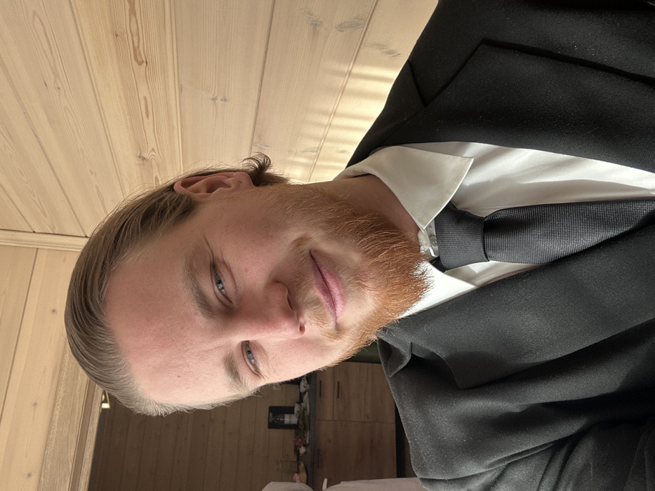 Старт-2 Снт, Russia: A male individual is depicted in a close-up, chest-up portrait indoors. He has fair skin, light brown hair slicked back, and a reddish-brown beard and mustache. His eyes are blue, and he exhibits a subtle, closed-mouth smile while looking directly at the camera. He is attired in a white collared shirt, a dark, textured necktie, and a black suit jacket. The background on the immediate right consists of a light-colored wooden plank wall, featuring horizontal grain and distinct diagonal shadows cast by an unseen light source. To the subject's left, a blurred background reveals a light-toned piece of furniture, likely a cabinet or counter, upon which several indistinct objects are placed, including a dark-colored bottle with a label. The scene is brightly illuminated.