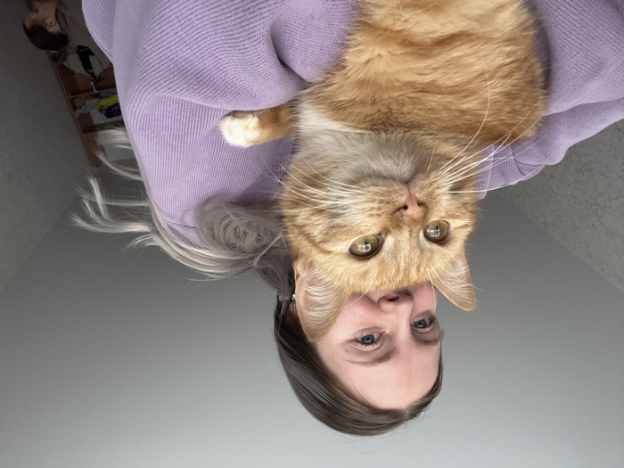 The image depicts an indoor scene in Chaikovsky, Russia. A female individual is positioned in the upper portion of the frame, largely obscured by an orange tabby cat. She has light brown hair with prominent gray highlights and is wearing a light purple ribbed garment. Her face, visible behind the cat's head, shows her looking towards the camera with a subtle smile. The primary subject is the orange tabby cat, held by the female. The cat has amber-colored eyes, long white whiskers, and a lighter-colored chest, and is looking upwards and slightly to the left. One of the cat's front paws, white with an orange patch, rests on the female's shoulder. The background features a light gray textured wall on the left and a plain light gray ceiling. In the lower right background, an out-of-focus wooden shelving unit containing various items is visible, along with a second, partially visible individual with dark hair, who appears to be seated or leaning down.