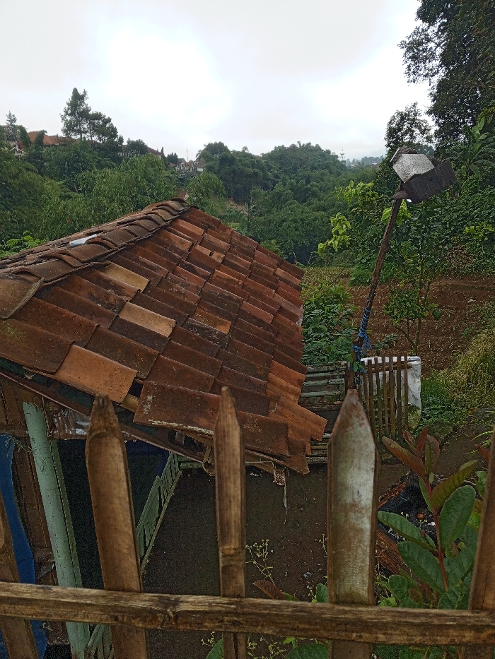 An aged tile roof dominates the view, partially obscuring a lush green hillside. A makeshift light fixture stands tall, its wires subtly visible. A weathered wooden fence, featuring pointed posts, runs across the foreground, framing the scene. Overcast skies mute the colors, adding a sense of tranquility to the rustic landscape. Vegetation peeks through the fence, blurring the line between the cultivated and the wild.
