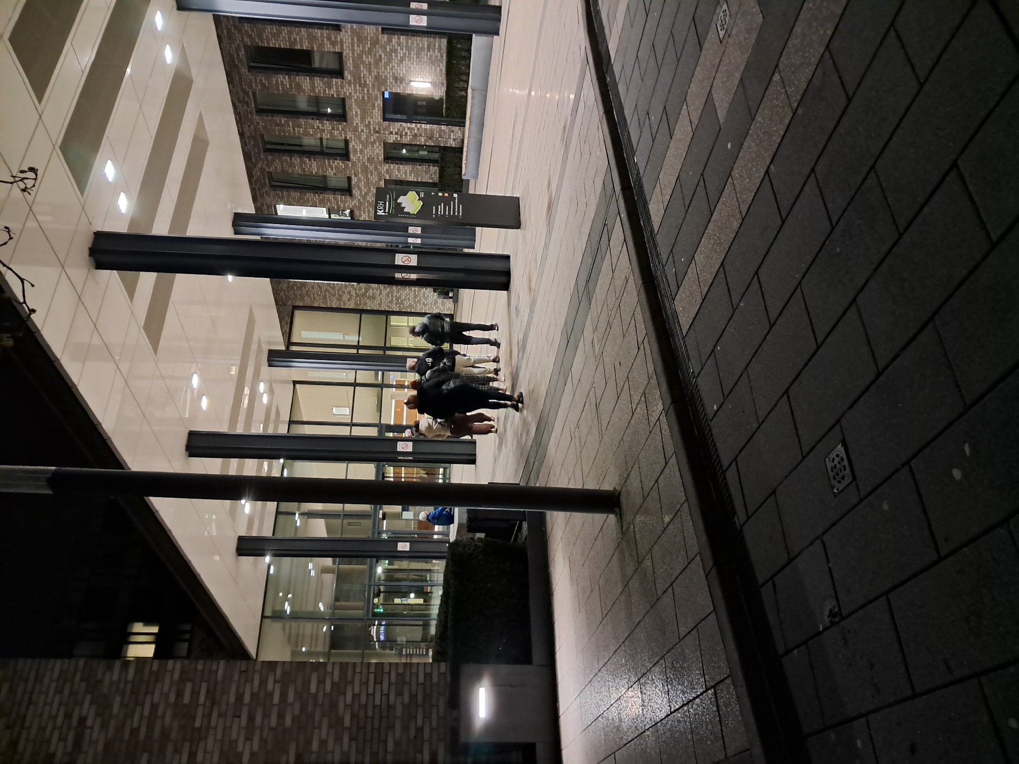 This is an exterior shot taken in the city of Hanover, Germany. The photo presents an urban landscape with a focus on architecture and a small group of people. The scene is dominated by modern buildings with a combination of materials like brick and glass. The architectural style involves strong lines and geometric shapes. Lighting appears to be primarily artificial, illuminating the area with a somewhat cool tone. A group of people are positioned in the middle of the frame, seeming to be walking or gathered in the outdoor area between buildings. Their activities are not clearly defined beyond their presence in this urban space. The foreground features a paved walkway, possibly made of stone, which appears to run along the side of the building. The color of the pavement is mostly dark gray. The overall impression is that of a contemporary urban environment, possibly a commercial or institutional area in Hanover.