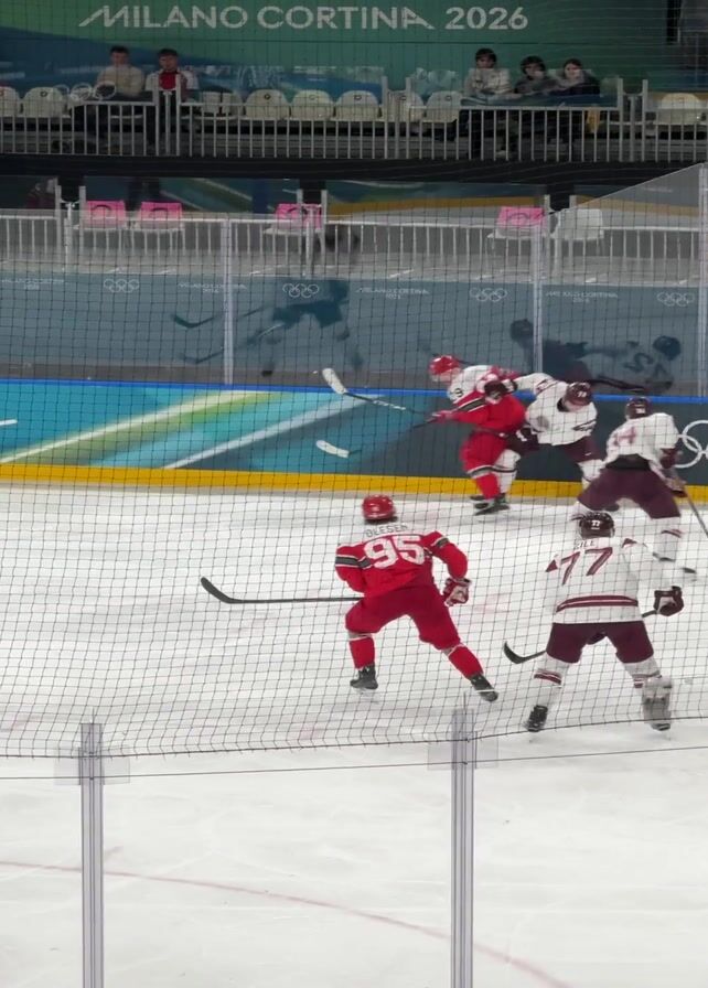 This video shows an ice hockey game underway. Two players in red jerseys are up against two players in white and maroon jerseys. The red-clad player with the number 95 on his back is in the middle of the rink, skating forward as he carries the puck. One of his teammates, also in red, is nearby. The other team's players are attempting to block them. The words "MILANO CORTINA 2026" are visible on the rink's backdrop.