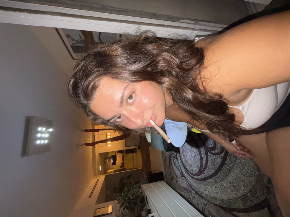 A woman with brown, wavy hair holds a lit joint in her mouth