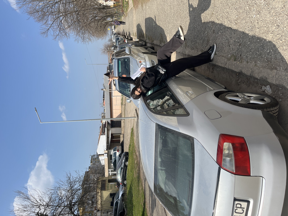 The image depicts a daytime outdoor scene on a street in Vratsa, Bulgaria, under a clear blue sky with scattered white clouds. The foreground features a silver four-door sedan (likely an Audi A4, B6 generation) parked on the right side of the asphalt road. The rear license plate is partially visible, showing "CP," indicating a Bulgarian registration. A young female subject with long dark hair, wearing a black long-sleeved top, black wide-leg pants, and black sneakers, is positioned partially outside the front passenger window of the sedan. She is leaning with her left hip against the car's body. Her head is turned towards the camera, and she is smiling. Her left arm is raised with an open palm, while her right hand holds white papers against her chest. Her left leg is bent, resting on the lower car frame, and her right leg is extended horizontally outwards from the vehicle. A small, dark bag with white accents is visible slung across her torso. Behind the silver sedan, a silver SUV is parked. A line of additional parked vehicles extends down the street on the right. A tall, grey streetlamp stands to the left of the SUV. The right side of the image features a wide, unpaved sidewalk or dirt path, lined with bare deciduous trees further in the distance. One individual, wearing dark clothing and a light-colored face mask, is visible walking on this path in the background. To the left of the road, a grassy area with multiple parked cars precedes a low-rise yellow building with a partial sign indicating "ЖЕНСКА МОДА" and "ВРАЦА." Beyond this building, other structures and residential buildings are visible. A sparse, bare deciduous tree is positioned in the upper left quadrant of the image. The scene is brightly lit by sunlight, casting distinct shadows on the ground and vehicles.