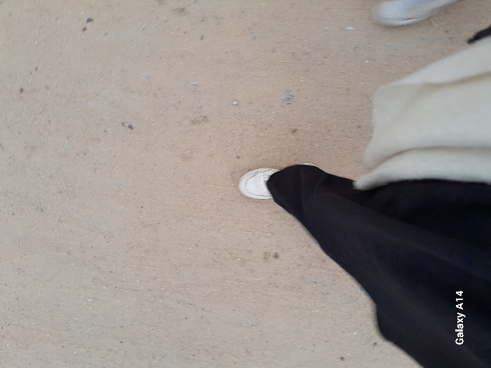 The image provides a high-angle view looking down at the lower body of an individual walking on a paved surface in the city of al-Qarara, Palestinian Territory. The person is wearing black trousers or a long skirt, a white casual shoe on the visible left foot, and a cream-colored garment partially draped over the black attire on the right side of the frame. The ground is a light beige or concrete-colored surface, exhibiting minor textured imperfections and scattered dark specks. A blurry, light-colored shoe is partially visible on the far right edge of the frame, indicating another foot in motion or an adjacent person. The watermark "Galaxy A14" is present in the lower-left corner.