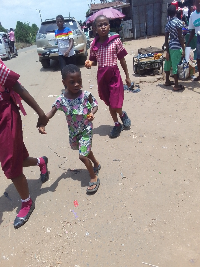 The image displays an outdoor street scene in Nsugbe, Nigeria, under bright daylight conditions. In the immediate foreground, three children are positioned on an unpaved, light-brown dirt road containing sparse debris. On the far left, a child, partially visible and wearing a maroon dress with a red-and-white plaid upper section, maroon socks, and black flat shoes, extends their left hand to hold the left hand of a second child. This second child, centrally located, wears a pink, green, and white patterned romper, grey flip-flops, and holds a small, orange-colored spherical object in their right hand. To the right of the central child, a third child, dressed in a maroon and red-and-white plaid school uniform with a white collar, dark athletic shoes, and white socks, holds two similar small, orange-colored spherical objects in their right hand while facing forward with their mouth slightly open. In the mid-ground, a dark-colored portable generator is situated on the right side of the road. Behind the children, on the left, a light-colored SUV is parked, with an adult female wearing a white t-shirt featuring horizontal rainbow stripes and dark trousers standing nearby. Further into the background, an adult male in a striped t-shirt and light green shorts is visible on the right, standing near the generator. Additional individuals are partially visible throughout the background, including a person near a white van on the far left and another under a purple umbrella near simple commercial-type structures on the right. Utility poles and green foliage are discernible against the sky in the distant background.