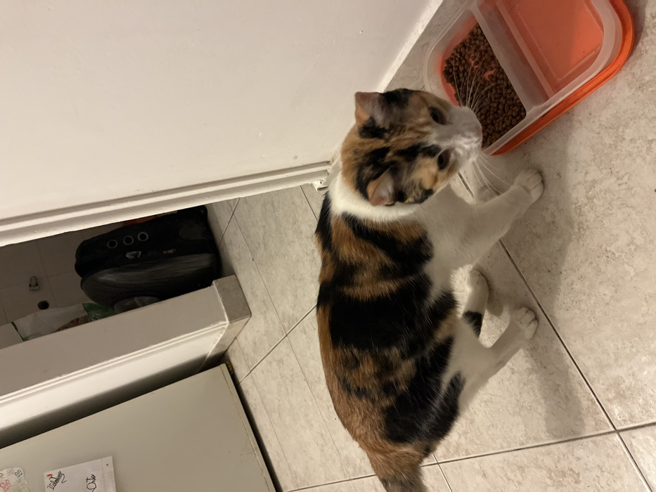 This image depicts an indoor scene in Bahía Blanca, Argentina. A calico cat is positioned on a light-colored tiled floor with dark grout lines, facing towards the right side of the frame. The cat has distinct patches of white, black, and orange-brown fur. Its head is lowered, directed towards an orange-based, clear-lidded pet food bowl. The bowl is divided into two compartments; the right compartment contains dry brown kibble, while the left compartment appears empty or holds liquid. In the background, to the left, a tall white appliance or cabinet door is visible, with a piece of paper attached to its upper left section. Directly behind the cat, a white door frame leads into another area. Beyond this frame, a dark, soft-sided object, possibly a pet carrier or luggage, is partially visible, leaning against a wall in a dimly lit space. No human subjects are present in the frame.