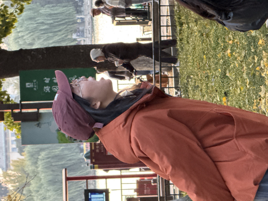 An outdoor scene in the Xicheng District, China, depicts a park or lakeside area. In the foreground, a person is seen in profile from the right, wearing a dark reddish-brown baseball cap, clear-framed glasses, and an orange-red hooded jacket. Their mouth is open, and their gaze is directed upwards and to the right. The person stands on green grass dotted with fallen yellow leaves. In the midground, a black metal railing separates the grassy area from a body of water, likely a lake or pond, with willow-like trees visible on the far bank. Behind the railing, various structures are present, including a red and yellow kiosk or building, and a vertical green sign with white Chinese characters, partially legible as "游时" (yóu shí) and "园风" (yuán fēng). A digital display screen with blue and white text is visible on a red structure to the left. A large tree trunk stands prominently to the right of the green sign. Several individuals are present in the midground and background. One person in a light grey beanie and dark attire walks from right to left, holding a white cup. Another individual in a brown cap and jacket stands near the railing, observing the water. Additional indistinct figures are visible further in the background. Distant buildings are partially visible through the trees on the far side of the water.