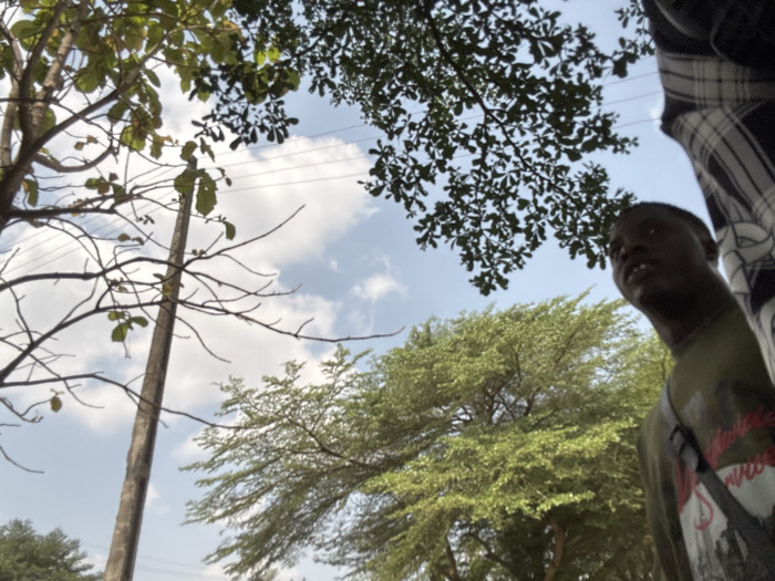 The image presents an outdoor scene in Osu, Nigeria, captured from a low-angle perspective looking towards the sky. In the right foreground, the upper torso and head of a dark-skinned individual are visible, wearing a dark olive-green t-shirt with a white graphic and a black cross-body bag strap. A black and white plaid garment is partially observed to the individual's right. The individual's head is tilted slightly upwards and to the left, with their mouth slightly open. The sky above is light blue with scattered white cumulus clouds. A tall, slender utility pole extends vertically on the left side of the frame. Various trees are present throughout the image, including one with dark, mostly bare branches and sparse green leaves on the left, and another with dense, bright green foliage dominating the lower mid-ground. Overhead, dark green tree canopies partially obscure the sky. Thin utility wires are discernible horizontally across the upper frame. No explicit interactions are depicted.