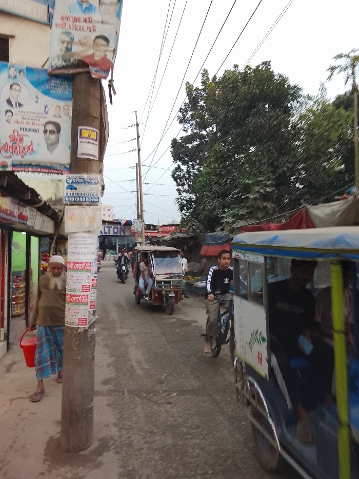An outdoor scene depicts a street in a commercial area of Tarabo, Bangladesh
