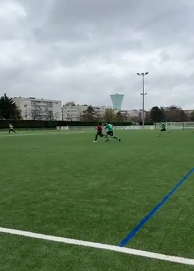 The video depicts a soccer game on a green artificial turf field under a cloudy sky