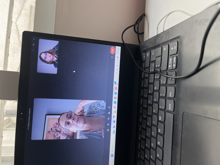 A black laptop displays an active video call on a white desk. The laptop features a Spanish keyboard layout, evident from the 'Ñ' key, and is connected by a black cable draped across the keyboard and a white cable plugged into its right side. The screen shows two women engaged in a video conference. The larger video frame on the left features an older woman with short, light brown hair, wearing glasses and a light-colored patterned top. She rests her chin on her left hand, gazing towards the camera. Behind her, a framed picture of pink and white flowers is visible. The window title indicates "Cifrada de extremo a extremo" (End-to-end encrypted). The smaller video frame in the upper right corner displays a younger woman with wavy brown hair, wearing glasses and a dark top, with her lips pursed in a distinct expression. The laptop's Windows taskbar is partially visible at the bottom of the screen, showing "10:30 a.m. 2/21/2024" and various application icons. A red disconnect icon is also present on the screen. The immediate background behind the laptop reveals a window with vertical frames, allowing natural light into the indoor setting and showing a bright, possibly overcast, outdoor view. To the right of the laptop screen, a plain, light-colored wall or partition is visible. While the presence of a Spanish keyboard and language on the screen indicates a Spanish-speaking environment, there are no specific visual cues within the image to determine an exact location within the city of València, Spain.
