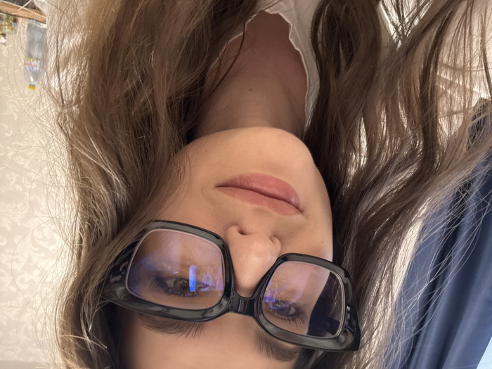 A close-up portrait shows a female subject with long, wavy, brown hair. She wears large, black-framed eyeglasses, displaying blue and white light reflections on the lenses. Her lips are slightly parted. A white garment with a ruffled edge is visible on her upper torso. The background on the left features a dark blue pleated curtain. The right background consists of light-colored wallpaper with an ornate, repeating pattern. On a surface in the lower right, a clear plastic bottle with a yellow cap and a white label is partially visible, alongside other indistinct shiny objects. The scene is an interior room. The specific location within the city of Chaikovsky, Russia, is not identifiable from the visual information provided.