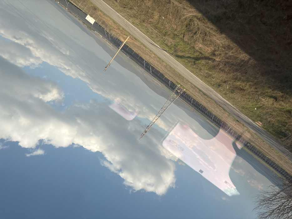 The image presents a tilted, wide-angle view of a semi-rural landscape located in the vicinity of Karnobat, Bulgaria. The upper portion of the frame features a clear blue sky interspersed with large, white cumulus clouds. A prominent reflection of a light-colored smartphone or similar rectangular device is visible in the upper-left and mid-left areas, indicating the photograph was taken through a window. The middle ground is dominated by a long, narrow paved road or path running diagonally from the mid-left foreground towards the distant right. To the immediate left of this road, a large solar photovoltaic panel array extends into the distance, appearing as a dark, linear structure bordered by a fence. Two types of utility poles are present: a tall, lattice-style metal electricity transmission tower stands to the left of the solar array, slightly obscured by reflections, and a simpler wooden utility pole is positioned further along the road, also to its left. The land to the right of the road consists of dry, yellowish-brown grass and sparse vegetation. In the background, low, rolling hills or mountains are visible under the cloudy sky. No individuals or active subjects are discernible within the scene.