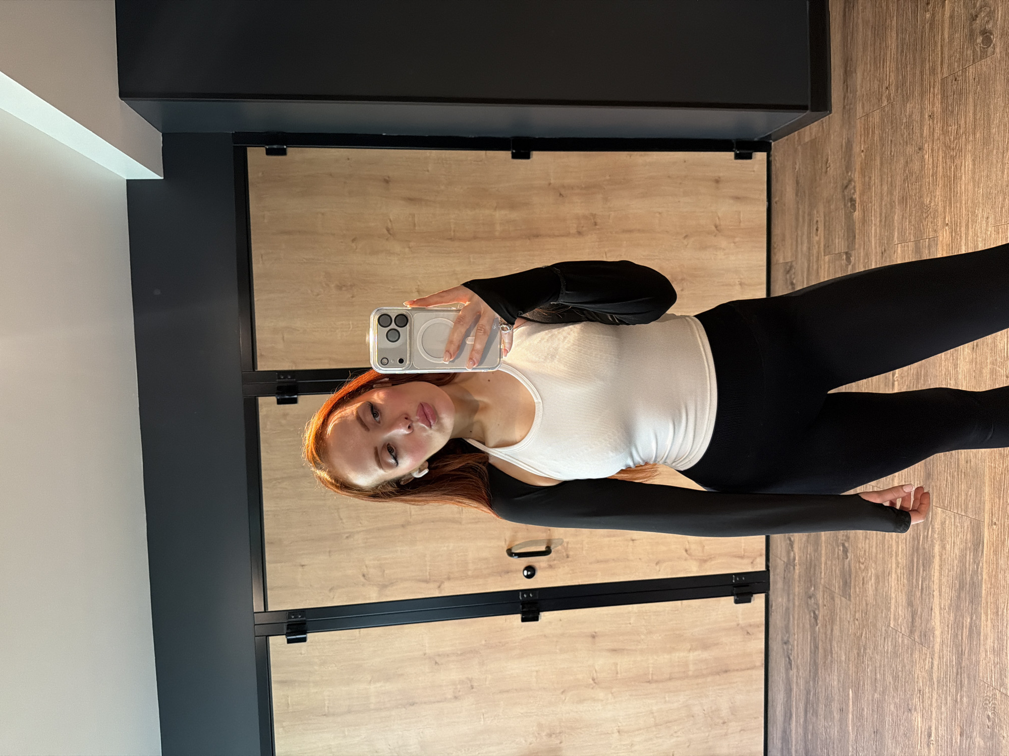 A woman with red hair is taking a selfie in front of a wall with light brown wooden doors framed by black metal. She is wearing a white tank top, black leggings, and a black long-sleeved shirt. She is holding a white iPhone with a silver case. The location appears to be indoors, possibly a locker room or storage area. There is no evidence in the image to suggest the location is in Paris, France.