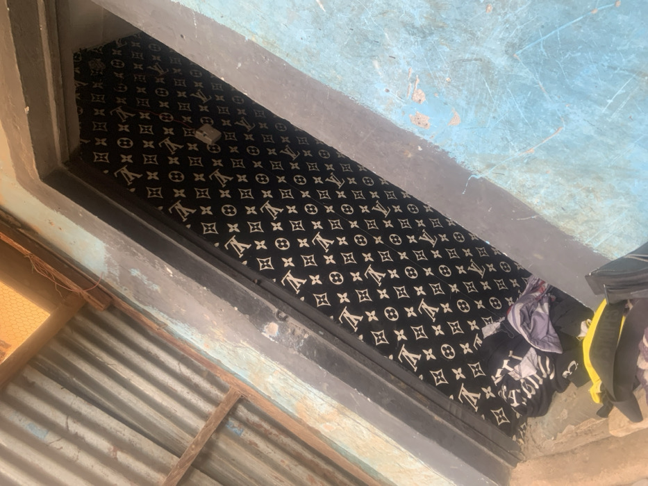 An overhead, tilted photograph captured in Bwari, Nigeria, depicts a closed, coffin-shaped object or large rectangular container positioned lengthwise within a narrow concrete doorway or alcove. The object is draped in black material featuring a repeating white "LV" monogram and quatrefoil pattern, secured by a single metallic latch or padlock positioned centrally along its visible length. Below the object, to the lower left, a disordered stack of various garments, including items in yellow and black, is visible. The immediate environment includes rough concrete walls, with surfaces painted in faded light blue and dark grey. Above and to the left, a corrugated metal roof structure supported by wooden beams, and a section of wire mesh are partially visible. The scene is illuminated by ambient daylight. No human subjects or discernible activity are depicted.