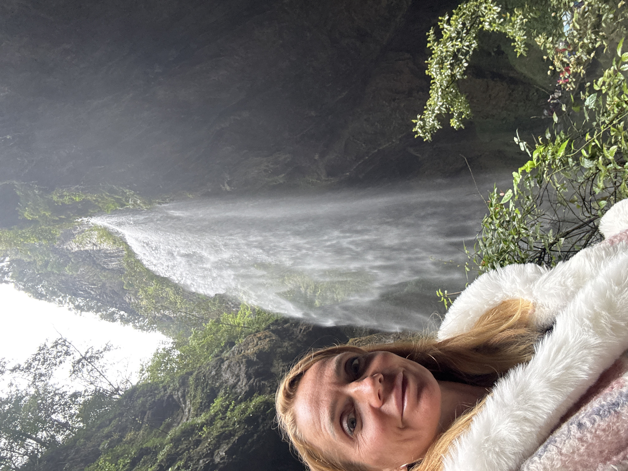 A woman lies at the edge of a precipice with a waterfall behind her