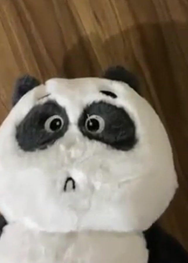 A close up video shows a plush panda toy on a wood grain surface