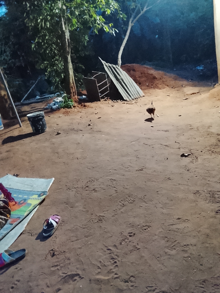 An outdoor scene at dusk with a dirt ground. A rooster walks away from a pile of corrugated metal leaning against a mound of dirt and a small metal structure. A black bucket sits next to a tree on the left. A colorful mat and a pair of sandals rest on the lower left of the frame. Several footprints and animal tracks are visible on the ground.