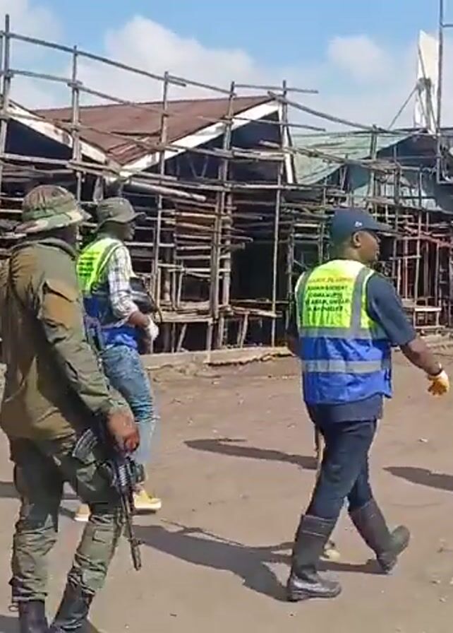 The video depicts a group of five people walking on a dirt road alongside an asphalt road in what appears to be an urban or suburban environment. The person closest to the camera is wearing a light brown jacket and a hat. Two individuals are dressed in military-style fatigues and carry rifles, while another person wears a blue and yellow reflective vest with the words "COMMUNE DE KARISIMBI" printed on it. They appear to be directing traffic or pedestrian movement. The fifth person, wearing a blue and white checkered shirt and yellow sneakers, is walking alongside the military personnel. In the background, there is a partially destroyed structure that looks like market stalls. A sign with "INTERNET HAUT DEBIT VIA FIBRE" is visible. The overall setting suggests a scene of civil unrest or post-conflict cleanup.