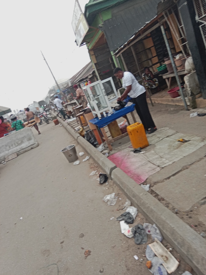 An outdoor street scene captures a bustling market atmosphere. A man wearing a white shirt is positioned behind a blue table with a glass display case. A yellow container rests beside the table, which is covered with a dirty cloth and a pink mark. Scattered trash litters the curb and street. Other people and motorcycles populate the background along with market stalls. The sky is overcast.