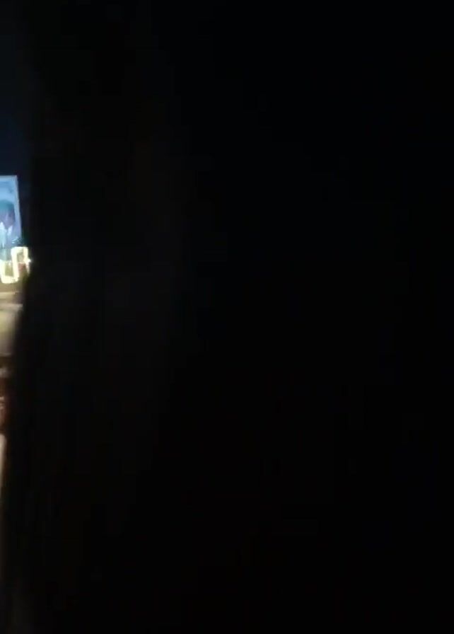 nighttime scene of a roundabout decorated with Christmas lights. At the center of the roundabout is a tall, white monument topped with a red, crown-like decoration. The monument and roundabout are outlined with strings of white and yellow lights. A silver car drives past the roundabout. The camera is positioned on the street, providing a view of the roundabout. The road is dark and wet. There are streetlights in the background and a billboard on the left side.