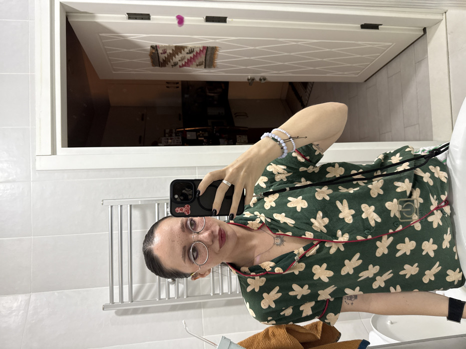 The image captures a female individual taking a mirror selfie within what appears to be a residential bathroom. The specific location within Batumi, Georgia, is not discernible from the visual information provided. The individual, observed from the chest up, wears a dark green, short-sleeved button-up shirt patterned with light beige abstract figures and accented with red piping. She has dark hair pulled back and wears round, thin-rimmed spectacles. Distinct white makeup is applied beneath her eyes, and her lips are colored with dark red lipstick. A silver necklace with a sun-like pendant is visible, along with a light-colored tattoo on her left inner bicep. She holds a black smartphone, equipped with a red and white phallic-symbol-themed case, in her right hand (mirror image). Her fingernails are painted black, and a silver ring is present on her right ring finger. Her left arm (mirror image) displays multiple light-colored beaded bracelets and a black string bracelet, in addition to a black fabric wristband. A black strap or lanyard hangs from her neck/shoulder. The bathroom features white tiled walls and a chrome heated towel rack on the left. A portion of a white toilet is visible in the lower left foreground. An open white door, featuring a recessed geometric pattern, reveals a dimly lit adjacent room, likely a kitchen or utility area, characterized by dark cabinetry. A small, patterned textile hanging in pink, brown, and cream, and a pink pom-pom, are affixed to the wall near the door frame.