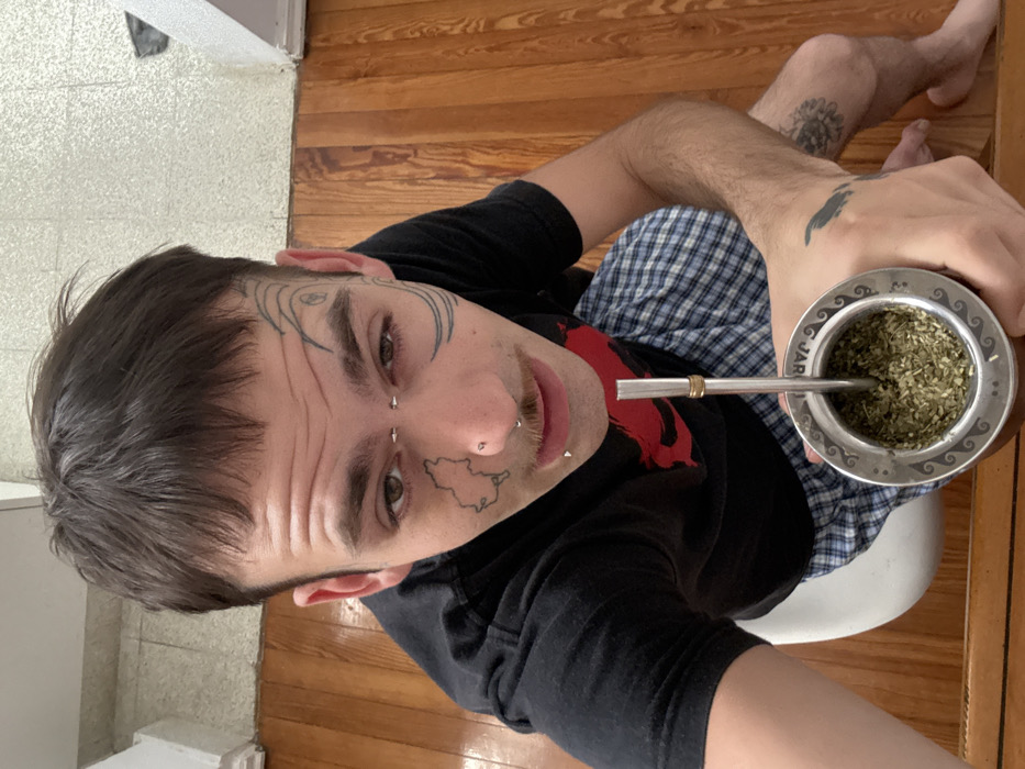 The image depicts a young adult male consuming mate in an indoor residential setting in Buenos Aires, Argentina