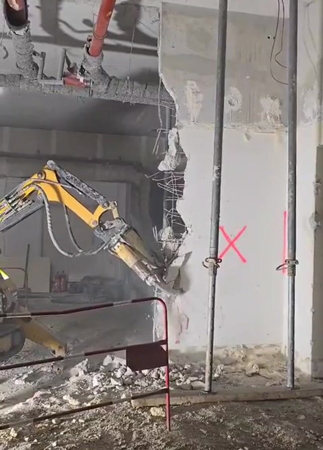 demolition scene. A yellow hydraulic excavator with a jackhammer attachment is breaking down a concrete wall. The wall is reinforced with rebar, visible in the broken section. Two vertical metal support beams are in front of the intact portion of the wall, marked with red X's. Red pipes run along the ceiling above. The floor is covered in rubble and dust from the demolition. A red metal barrier is positioned to separate the work area from the viewing area.