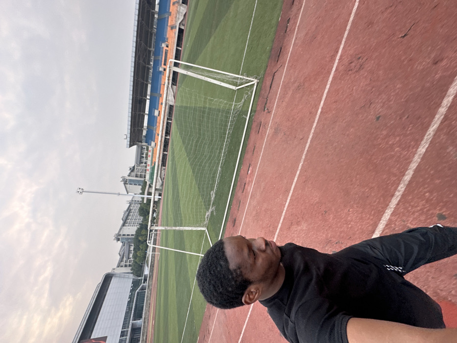 An outdoor sports complex in Jiangjin, China, is depicted under an overcast sky. In the foreground, a male individual, appearing to be of African descent, is seen from the chest up, positioned slightly left of center, looking towards the right. He has short, dark hair and wears a black short-sleeved t-shirt and dark athletic pants with white accents. He stands on a red-orange running track, marked with white lane lines, showing signs of wear and cracking. Immediately behind the individual and extending into the mid-ground is a green artificial turf soccer field, featuring a white metal soccer goal with a net. In the background, a large, modern building with a curved, light-colored facade and a red banner is visible to the left. To the right, a section of stadium seating with blue and orange seats is present under a canopy, along with multiple multi-story buildings and a tall floodlight pole.
