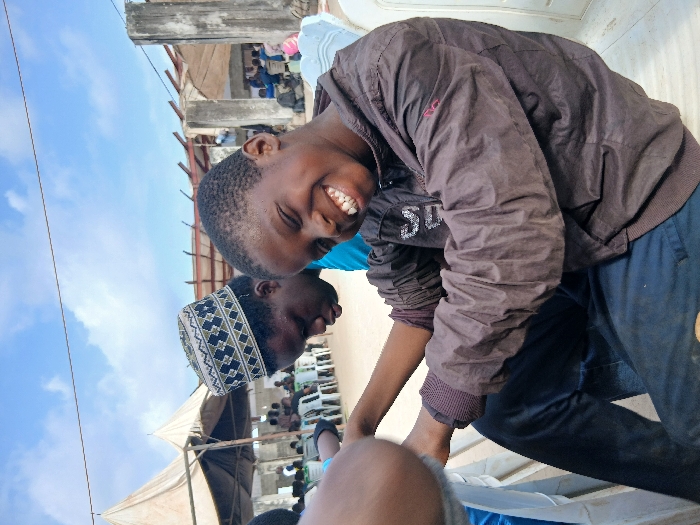 The scene depicts an outdoor gathering in Epe, Nigeria. In the foreground, a young Black male is seated on a white plastic chair, smiling broadly with teeth visible and eyes squinted. He wears a dark brown synthetic jacket with ribbed cuffs and collar, and dark blue trousers. To his left, positioned slightly behind him, another young Black male is seated, wearing a light blue garment and a traditional patterned cap (kufi) with dark green/blue and white geometric designs. His head is tilted downwards, and his gaze is directed away from the camera. His left arm is extended towards the first male's right arm or lap area. A third individual's arm, clothed in a light grey sleeve, and a blue-clad leg are partially visible on the far left. In the mid-ground, numerous individuals are seated on white plastic chairs under a large, light-colored, pointed tent structure. Beyond the tent, concrete pillars and structural components of a building, possibly incomplete or in disrepair, are visible. The sky above is blue with scattered white clouds. The ground surface appears unpaved.