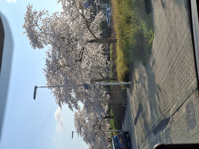 The image displays an exterior street scene captured on a clear, sunny day, likely in spring, from within a vehicle looking forward through the windshield. The location is an urban or suburban street in a city of Unknown, Unknown. The upper frame consists of a bright, light blue sky featuring a few small white cumulus clouds. Below this, a row of mature trees, densely covered in white blossoms, consistent with cherry trees, extends horizontally across the midground. Two modern grey streetlights with horizontal, flat luminaires are prominent; one in the center-left foreground and another further back to the left. In the lower half of the image, a grey paver-style sidewalk or pathway is visible, extending from left to right and curving into the background. A metal manhole cover is present on this paved surface in the lower-left corner. A raised curb separates the pedestrian area from an asphalt road section where a dark grey compact SUV is parked, facing away from the viewer, in the left midground. The vehicle's rear license plate is partially visible, appearing to be a yellow European type with a blue stripe. Behind the paved areas and beneath the trees, landscaped sections contain low-lying green and reddish-brown bushes and ground cover. Faint, indistinct building structures are discernible in the far background through the trees. No people are visible, and no actions or interactions are depicted within the scene.