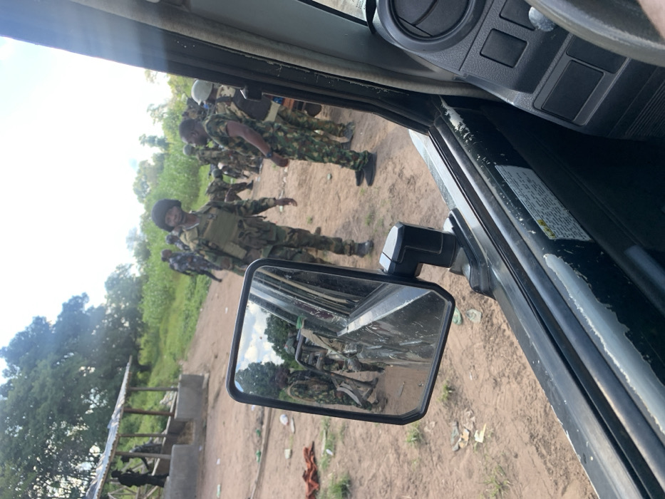 This image captures an outdoor scene in Takum, Nigeria, viewed from the interior of a dark-colored vehicle, looking through the driver's side window and into the side mirror. In the immediate foreground, the vehicle's interior is visible, including a dark door frame exhibiting areas of chipped paint, a black side mirror housing, and a portion of the dashboard and steering wheel on the right. A warning label is affixed to the inner door frame. Outside the vehicle, a group of approximately twenty individuals, predominantly male, are present on a reddish-brown dirt ground. They are dressed in camouflage military uniforms; several wear tactical vests or body armor, and some have helmets. A central soldier in the midground, wearing a tactical vest and a dark, potentially synthetic, head covering, faces the camera directly. To his right, another soldier is attired in a camouflage t-shirt and pants. Other soldiers are scattered across the scene, some standing, some in stooped postures, appearing to interact with objects on the ground or each other. Scattered debris, including what appears to be discarded fabric or plastic, lies on the ground. In the background, dense green foliage, including trees and tall plants, frames the scene. To the far left, a basic open-sided structure with a corrugated metal roof supported by wooden posts is visible. The sky overhead is partially cloudy. The vehicle's side mirror reflects additional soldiers in camouflage uniforms, standing near what appears to be another vehicle. One soldier in the reflection is observed holding a long, unholstered blade, possibly a machete.