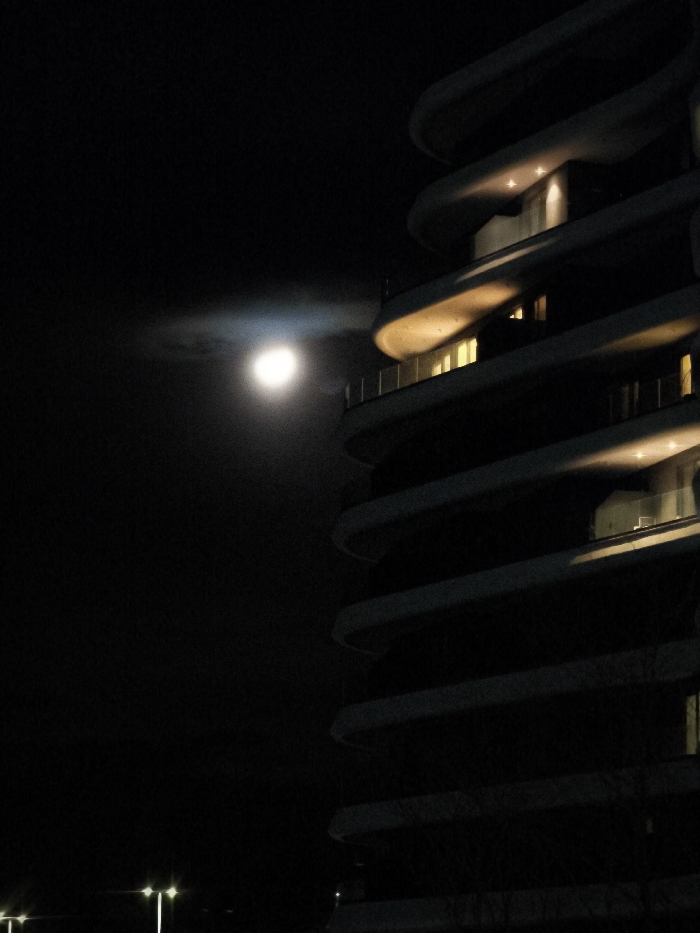 A night scene featuring a modern, curved balcony apartment building illuminated by interior lights. A bright moon shines on the left, partially obscured by thin clouds. Streetlights are visible at the bottom left. The darkness dominates the image, emphasizing the contrast between the bright moon, building lights, and the deep black sky and surrounding area.