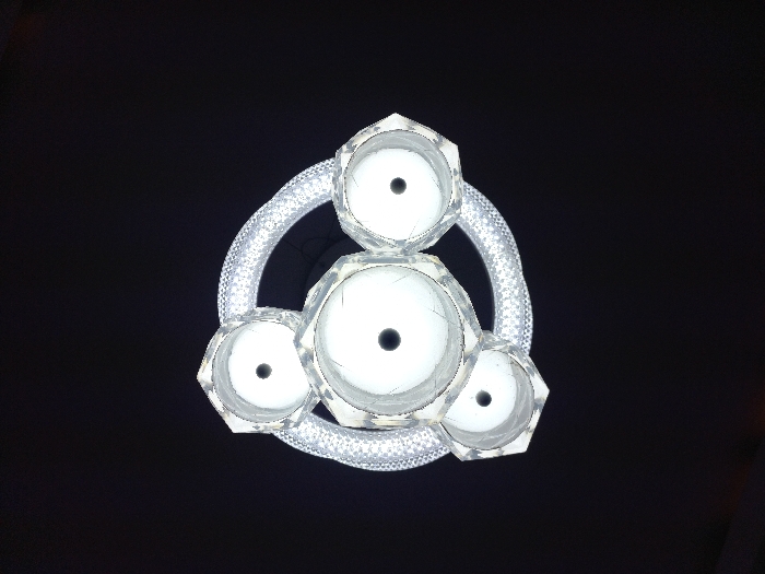 A circular, sparkling light fixture dominates a black background. It consists of four faceted light bases arranged around a ring of smaller, sparkling elements. Each base appears hollow, with a dark center. The central base is larger than the others, with intricate facets. The ring encircles the structure, connecting to each light base. The fixture emanates a bright, white light.