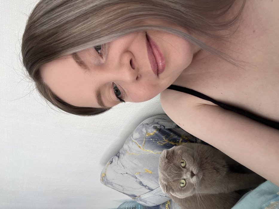The image depicts an indoor scene featuring one adult female and a domestic cat. The female occupies the right side of the frame, showing her left profile, shoulder, and upper chest. She has light-toned skin, light brown hair with blonde highlights, and her left eye, which appears green-blue, is clearly visible. Her lips are closed in a faint, pleasant smile, tinted light pink. She is wearing a black strap garment. The cat, identified as a Scottish Fold breed due to its folded ears, is light grey/fawn in color with striking yellow-green eyes, positioned to the left of the female. It is seated and looking directly towards the camera. Behind the cat and the female's left shoulder is a pillow with a distinct grey, white, and gold marble-like pattern. A blurred blue object is partially visible on the far left. The background consists of a plain, light-colored, textured wall. The female subject is engaged in taking a self-portrait, with the camera held close to her face and upper body, capturing both herself and the cat. The specific location within the city of Chaikovsky, Russia, cannot be determined from the visual evidence provided in the image.