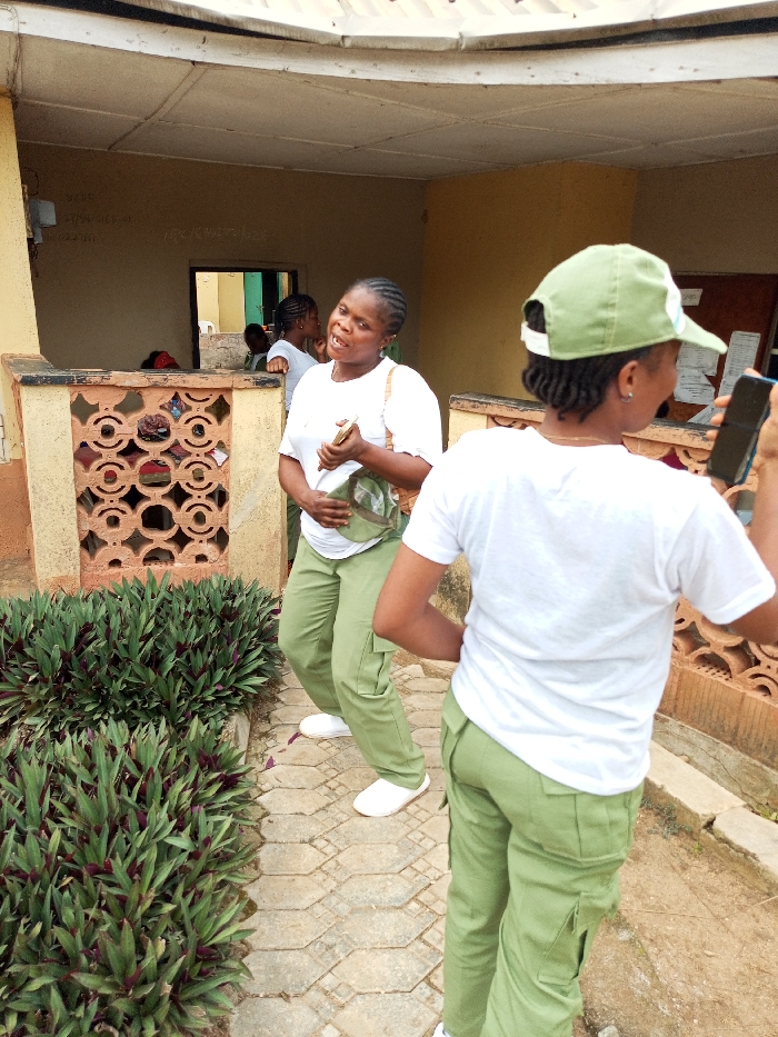 The scene is set outdoors in Aramoko-Ekiti, Nigeria, outside a single-story building featuring light brown walls and an overhanging roof with visible white ceiling panels. The ground is paved with interlocking hexagonal blocks. In the immediate foreground on the right, a person is observed from behind, wearing a white short-sleeved t-shirt, light green cargo pants, and a light green baseball cap with a white logo. This individual is holding a dark-colored smartphone vertically in both hands, positioned as if recording or photographing. Their hair is styled in dark, tightly braided or locked strands beneath the cap. In the midground, to the left of the foreground individual, a woman stands facing slightly right, with her mouth open as if speaking. She wears a white short-sleeved t-shirt, light green cargo pants, and white slip-on shoes. She has dark braided hair. In her right hand, she holds a light-colored object, possibly another smartphone or a small notepad. A green shoulder bag or pouch hangs from her left shoulder, resting against her abdomen. Between these two individuals and the building, a low decorative wall made of light brown blocks with repeating circular cutouts extends across the frame. Behind this wall, within a recessed area or doorway of the building, several other individuals, primarily women in white attire, are visible. One person leans on a surface within this opening. Faint, illegible markings or writing are present on the tan wall to the left of the opening. To the left of the decorative wall, a dense bed of green and purple-leafed plants (likely *Tradescantia spathacea*) lines the paved pathway. The lighting suggests bright daylight conditions.