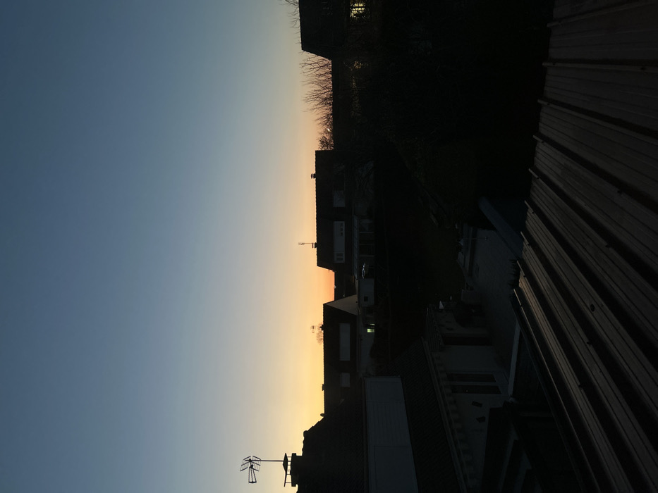 The image captures a residential neighborhood in Saint-Quentin, France, during twilight. The sky, occupying the upper portion of the frame, transitions from an orange hue at the horizon to a light blue, then a darker blue towards the top, indicating either sunrise or sunset. In the foreground, the dark, corrugated metal roof of a building is visible, sloping from left to right. Beyond this, several houses with dark, pitched roofs are silhouetted against the sky. A distinct television antenna is mounted on a chimney atop the roof of a house positioned on the left side of the midground. Artificial light is visible from within at least two distant houses: a faint green light in a central dwelling and a brighter yellow light in a house on the far right. Leafless tree branches and dense, dark shrubbery are interspersed among the houses, particularly on the right side of the frame. No individuals, explicit actions, or interactions are observable.