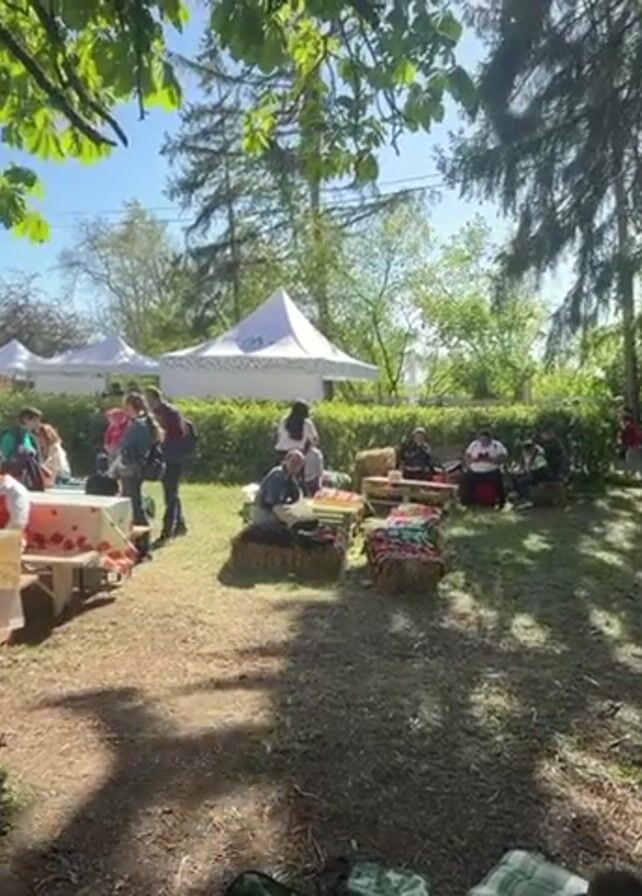 n outdoor scene, likely a fair or market, on a sunny day. Several white tents are set up, and people are milling around. Some are sitting at tables covered with tablecloths, while others are seated on hay bales. A few people appear to be engaged in craft activities. The area is shaded by trees, and a building is visible in the background. There is a sense of a community gathering.