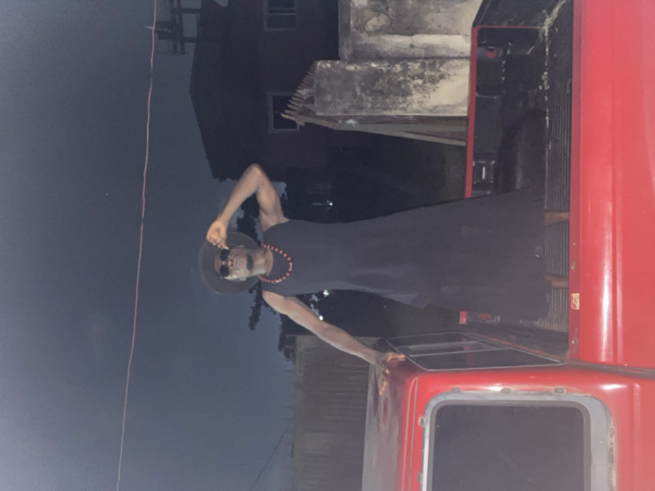 A person stands outdoors wearing a hat, sunglasses, a black dress, and a beaded necklace. The person poses by a red vehicle, possibly a truck, with their hand on its roof. The sky appears dark, suggesting it's nighttime. A building is partially visible in the background.