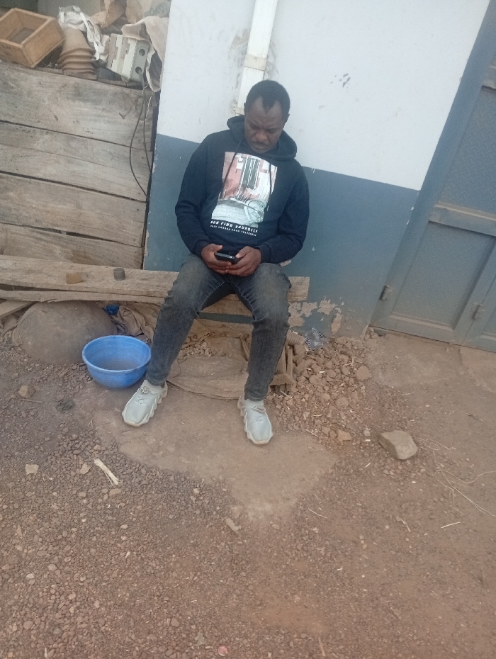 A man is seated outside against a white and blue wall. He wears a dark hooded sweatshirt, dark jeans, and gray sneakers. He is looking at a mobile phone in his hands. A blue bucket sits nearby on the ground. The ground is covered in small stones and dirt. Wooden planks and other objects are visible behind him to the left.