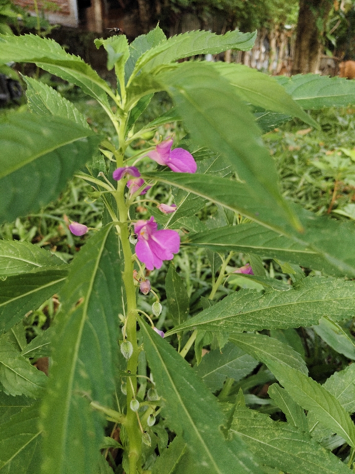 A close-up depicts a vibrant Jewelweed plant with large, serrated green leaves. Delicate pink flowers bloom along the stem, interspersed with seed pods. Small ants crawl up the stalk. The background consists of grass, foliage, and a hint of a structure in the distance, possibly a house or shed. The lighting suggests an outdoor setting.